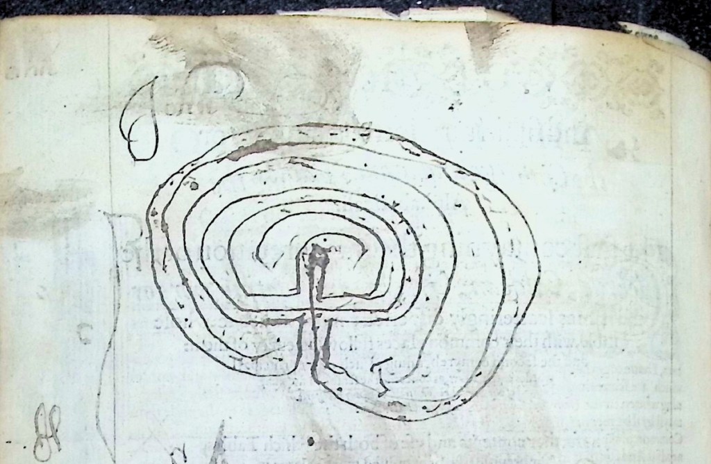 JCH Bonniwell family Bible, MS inscription “John” and drawing of a Labyrinth, First […] Concordance, sig. A1 verso (detail)