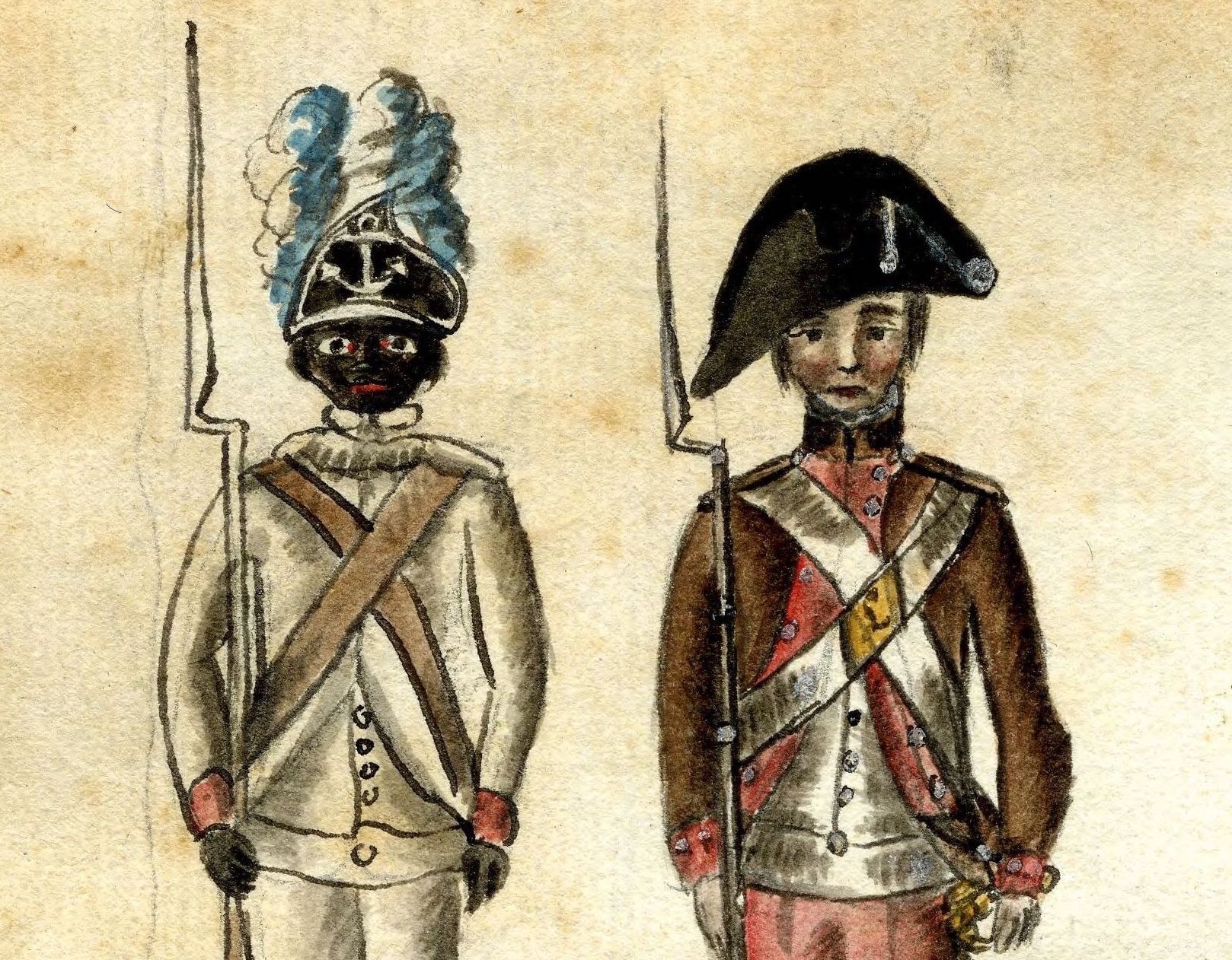 Verger, Jean Baptiste Antoine De, artist, [Soldiers in Uniform], 1781 (detail). The soldier on the right was a New England militiaman, one of many New Englanders (including, we believe, Jonathan Clark’s kin) that fought for the Patriot cause. More on this image, below.