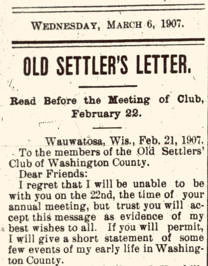 In all the various 1907 newspaper editions, and in Quickert’s 1912 history, the omitted passages were usually noted with three asterisks, like this * * * This was typical editorial practice for the time. But, of course, those asterisks piqued my interest. What had been cut? What additional things might Elizabeth’s full text tell us about the early days in old Washington/Ozaukee county?