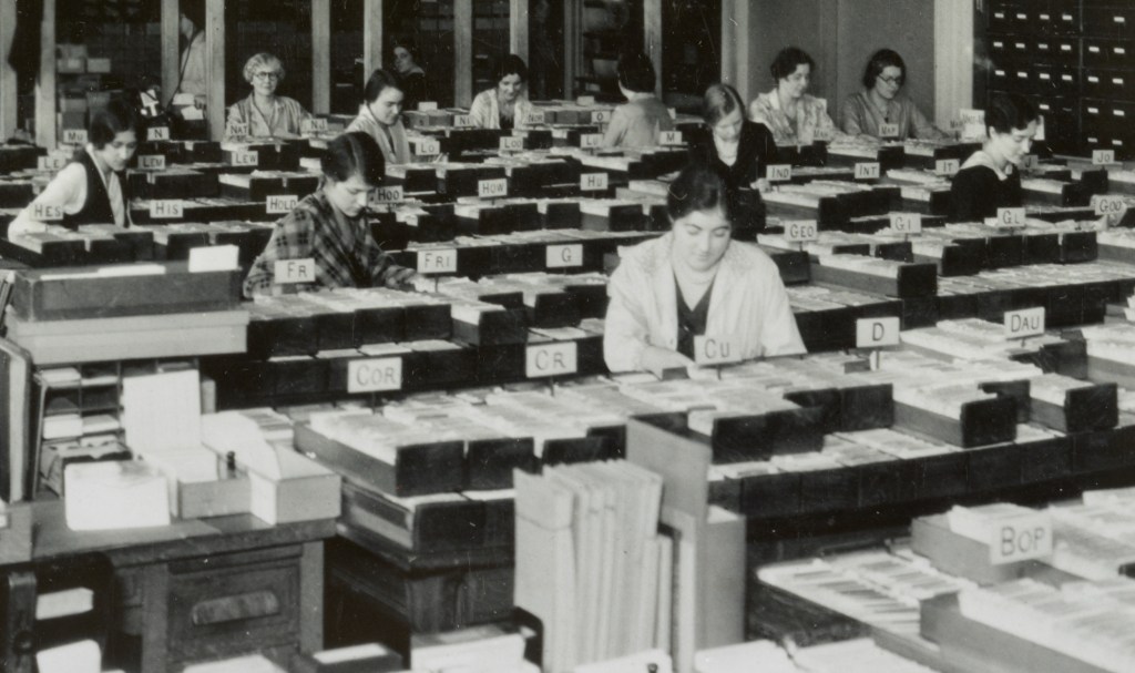 Harris & Ewing, photographer. Librarians working with catalog cards in the Processing Department of the Library of Congress, Washington, D.C. [detail]. [Between 1917 and 1920?]. Library of Congress.