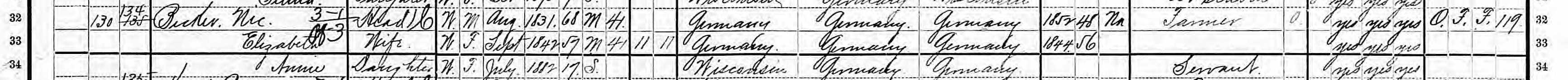 Nic., Elizabeth and Annie Becker, Mequon, Ozaukee County, Wisconsin. 1900 US Federal census, population schedule, detail. Click image to enlarge and open in new window.