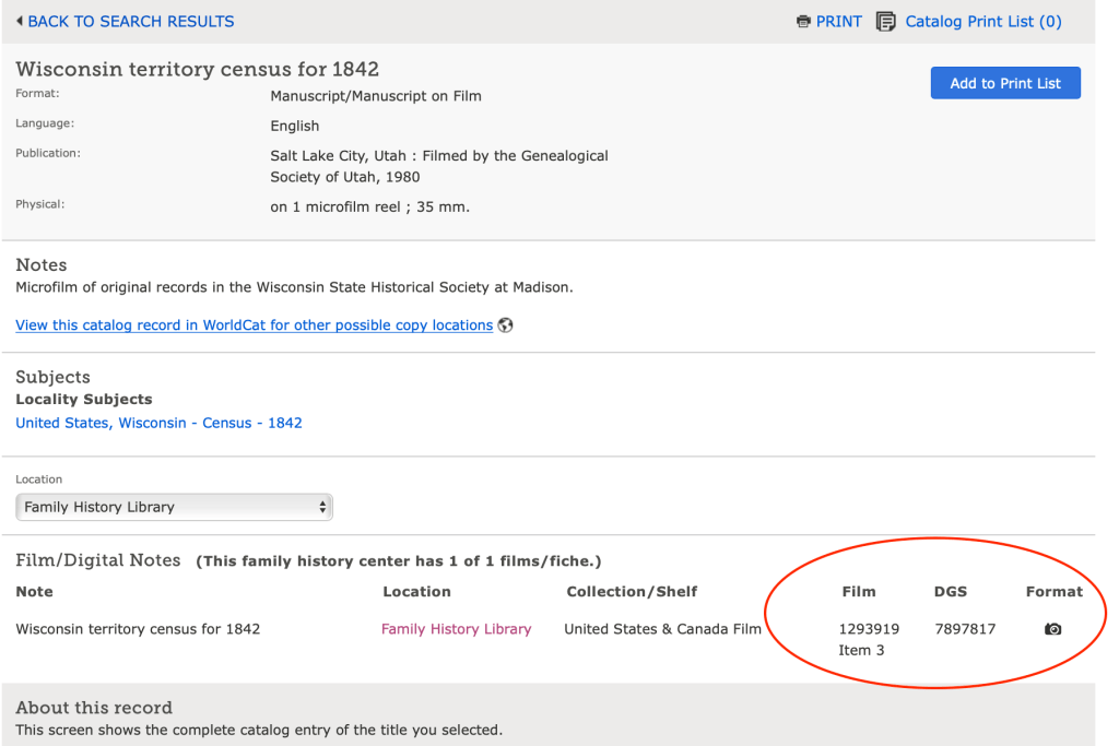 Once those microfilms are digitized, they are also assigned a “DGS” film number. The DGS film number for FHL film 1,213,919 is DGS 7,897,817, and the 1842 census also will be the third item on the digital version of the microfilm. Record these numbers for future reference and easy searching in the FamilySearch online catalog.