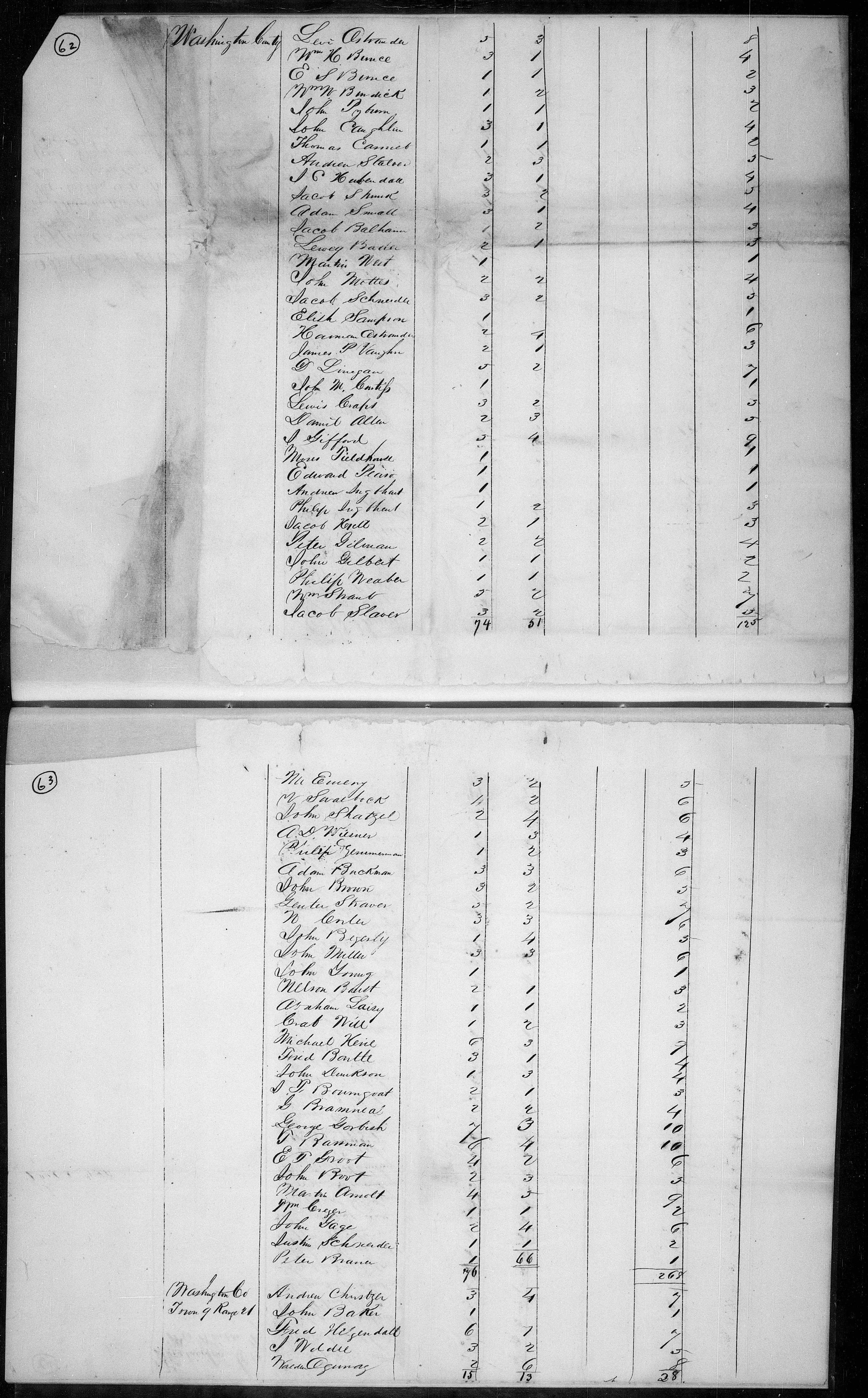 In the 1842 Wisconsin territorial census, Washington county is enumerated at the end of the bound volume of Milwaukee county census schedules. The Washington county census begins on film image 424 of 532, which shows Milwaukee county census pages 62 and 63: