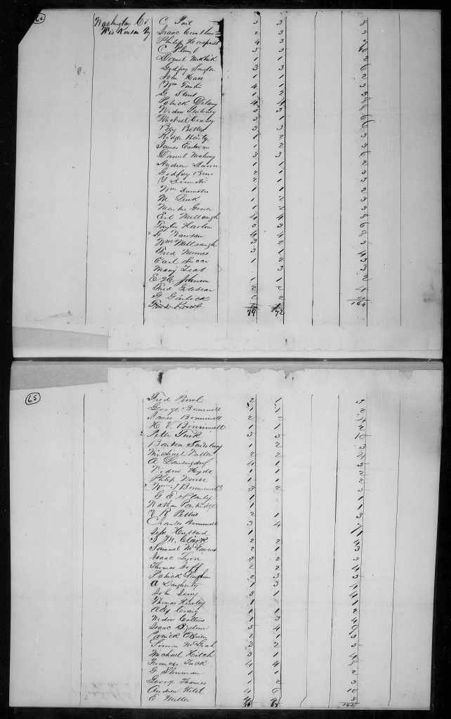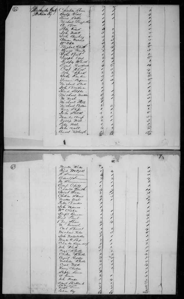 Like the other territorial and state censuses, the 1842 census lists only heads of households. The first two columns list numbers of “White Males” and “White Females,” the next two columns are for “Coloured Males” and “Coloured Females,” the column on the far right lists the total persons in each home. At the bottom of page 63 the enumerator was nice enough to note when he began to record the residents of “Washington Co. Town 9, Range 21,” i.e., the Town of Mequon.