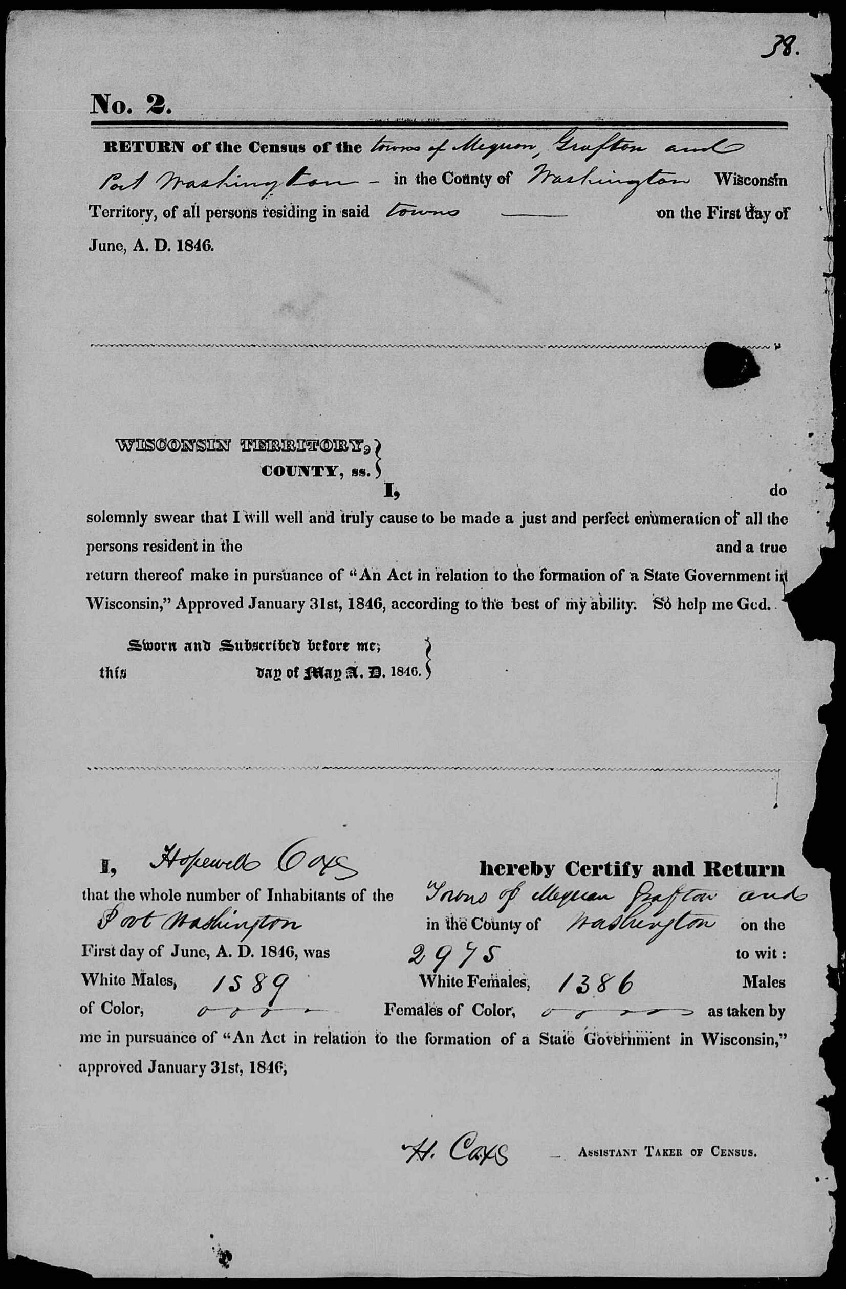 District No. 2 covered the eastern part of the county, and comprised the towns of Mequon, Grafton and Port Washington. The enumerator was Hopewell Cox. His summary page 38 is here, image 960 of 1103: