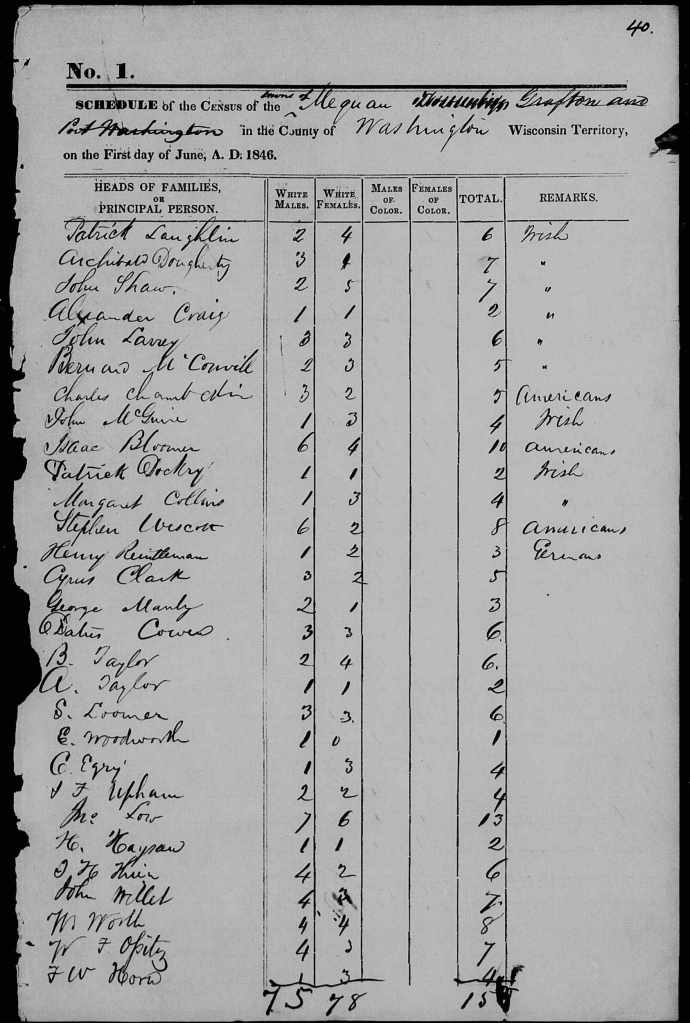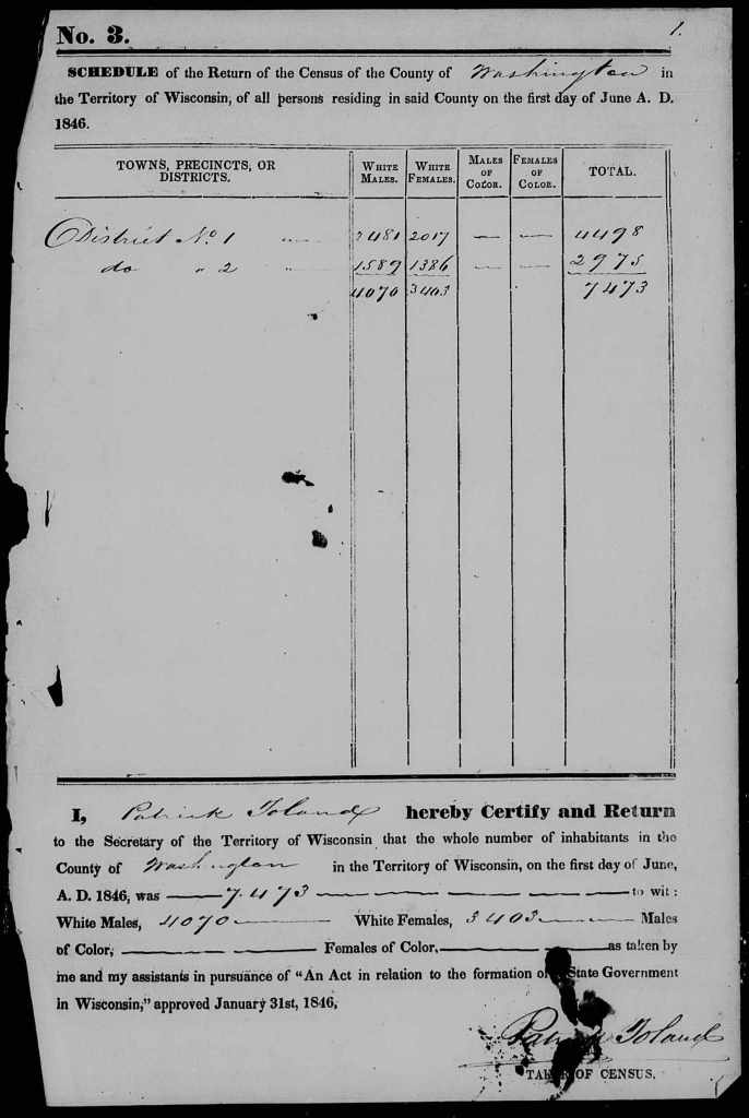 The focus of today’s post is the next Wisconsin territorial census, officially enumerated on June 1, 1846. It is available as FHL film number 1,293,920, aka DGS film number 8,117,163. Click one of the film numbers to navigate to the 1846 census images. The Washington county census page images begin on image number 922 of 1103