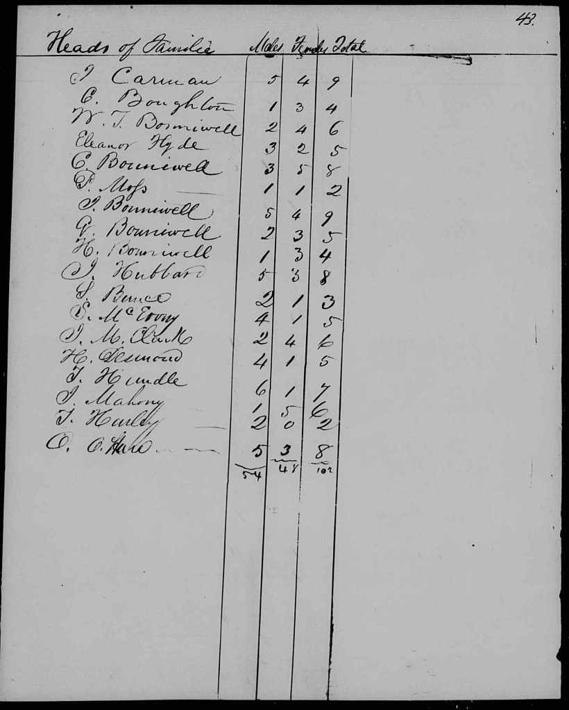 You can see that the questions are very much the same as in 1842. Heads of Families or Principal Person in the house, and the counting of white males and white females and “males of color” and “females of color.” There is also a space for remarks, and enumerator Hopewell Cox began by adding the nationality of each head of household, all of whom appear to be either Irish, German or “American,” shorthand of that era for English-speaking Americans, typically from New York and New England. It was an interesting experiment, four years ahead of the federal census requiring the same information. But after recording the nationalities of 13 “principal persons,” Cox stopped, for reasons unknown.