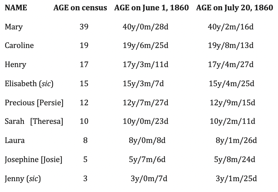 One interesting “error” (?) from 1850 repeats itself on this 1860 census. Once again, Mary’s age is rounded down to 39, even though she was actually 40 years old before June 1, 1860.