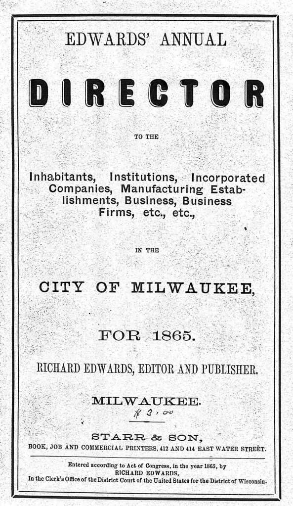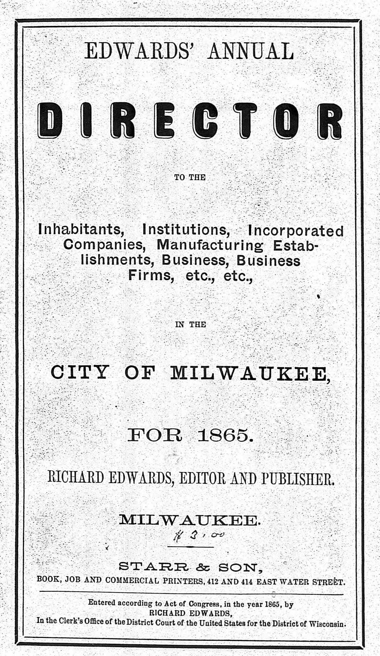 The 1865 edition of the city directory introduced big changes, both for the book and for Milwaukee’s street addresses. The new publisher was Richard Edwards, who was also responsible for similar volumes in other major cities such as St. Louis, Louisville and New Orleans. He announced his new Milwaukee venture—after a dozen pages of advertisements—with this handsome title page: