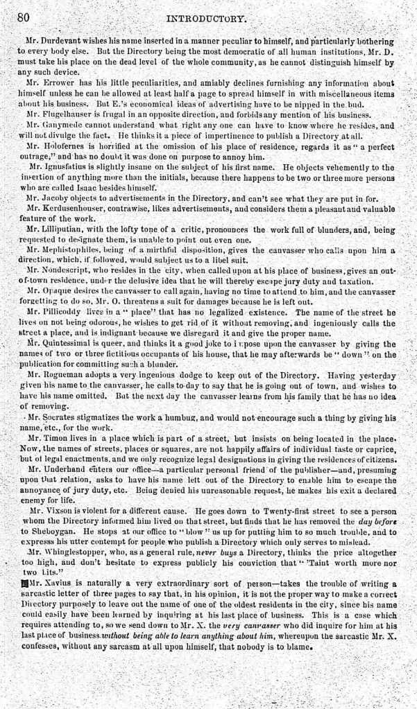 Towards the end of the first “Introductory” page, Edwards begins a full A to Z list of all the pseudonymous complainers, avoiders, cheapskates, grumblers, and general pains-in-the-neck that the publisher dealt with in producing the 1865 directory. The list continues on the next page, describing “Mr. Durdevant” to “Mr. Xavius”: