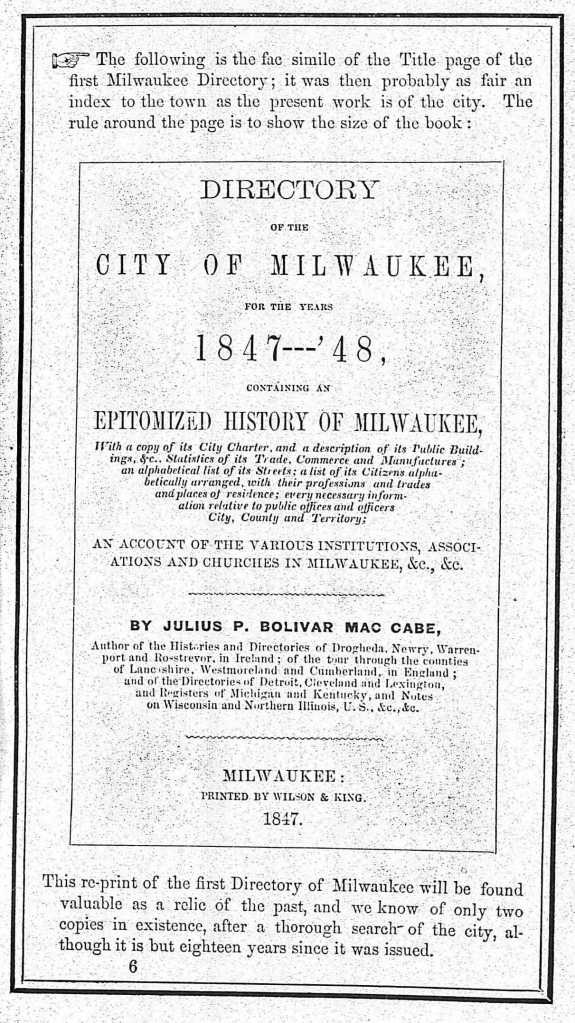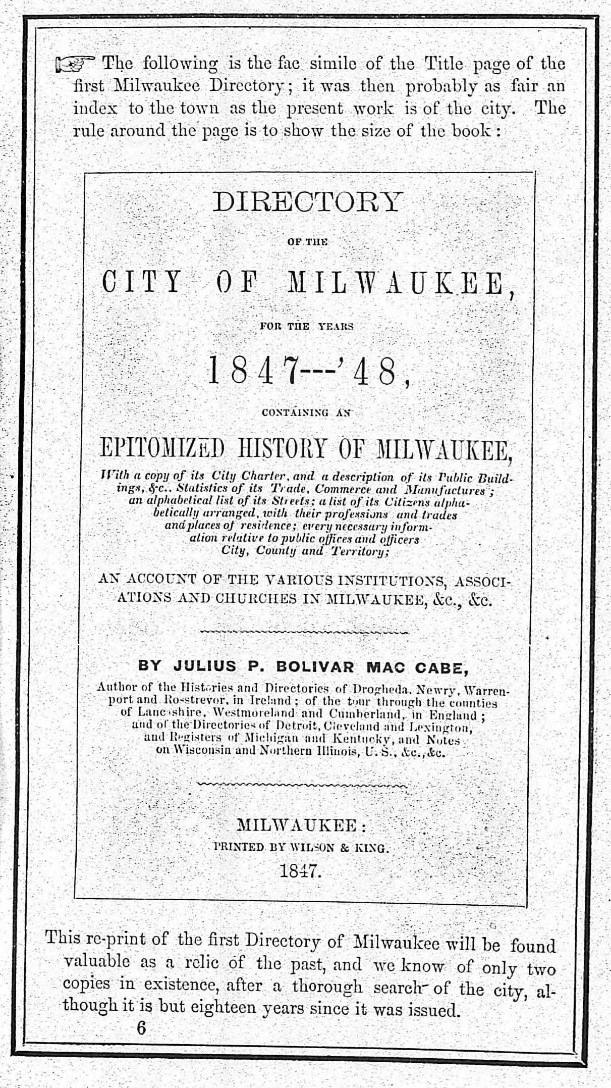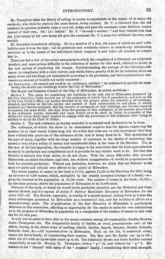 Page “81” concludes with a discussion of the growth of the city’s population, the popularity of certain surnames, and an overview of the features of the 1865 volume, which include a Historical and Commercial Review—a short history of the city—and a complete reprint of the first Milwaukee directory, Julius P. Bolivar MacCabe’s Directory of the City of Milwaukee for the years 1847–’48.