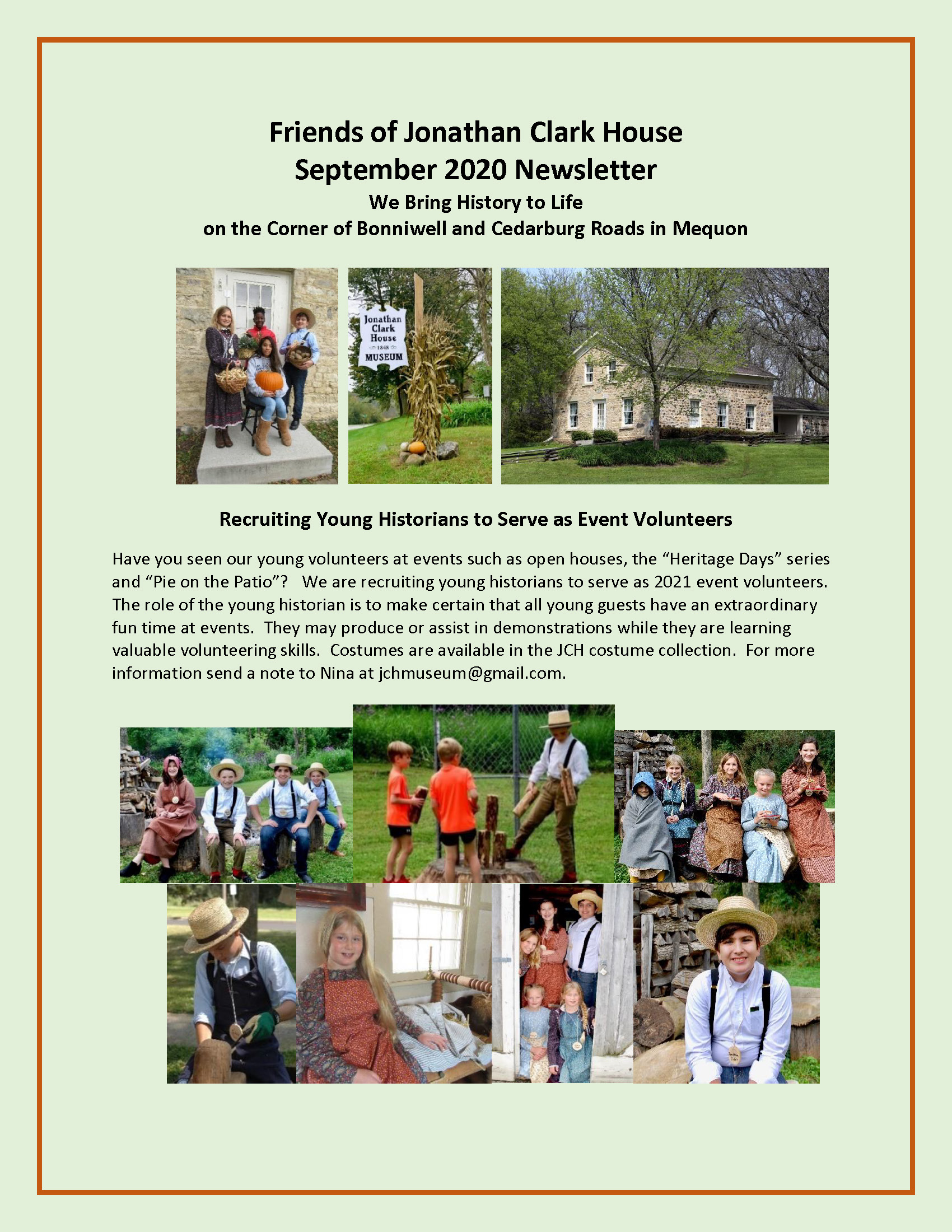 Education, and developing the next generation of history lovers, is a big part of what we do. If you know a school-aged person or two that lives in or near Ozaukee County and the Clark House, and that might be interested in participating in museum events, send an email to Nina Look at jchmuseum@gmail.com