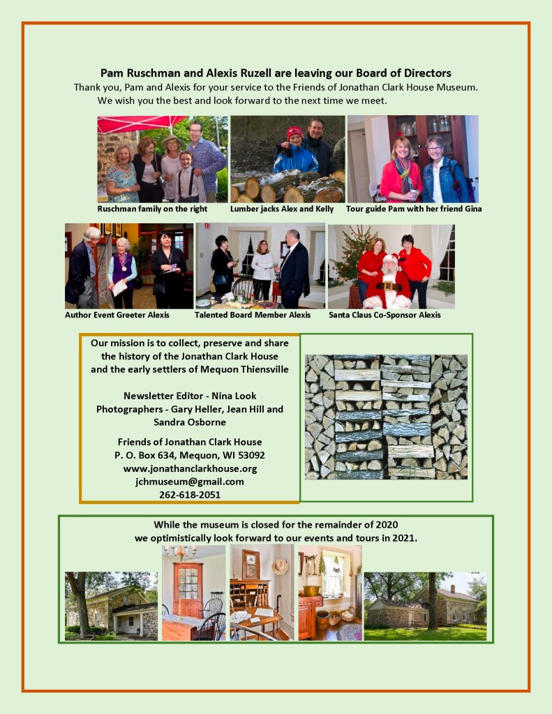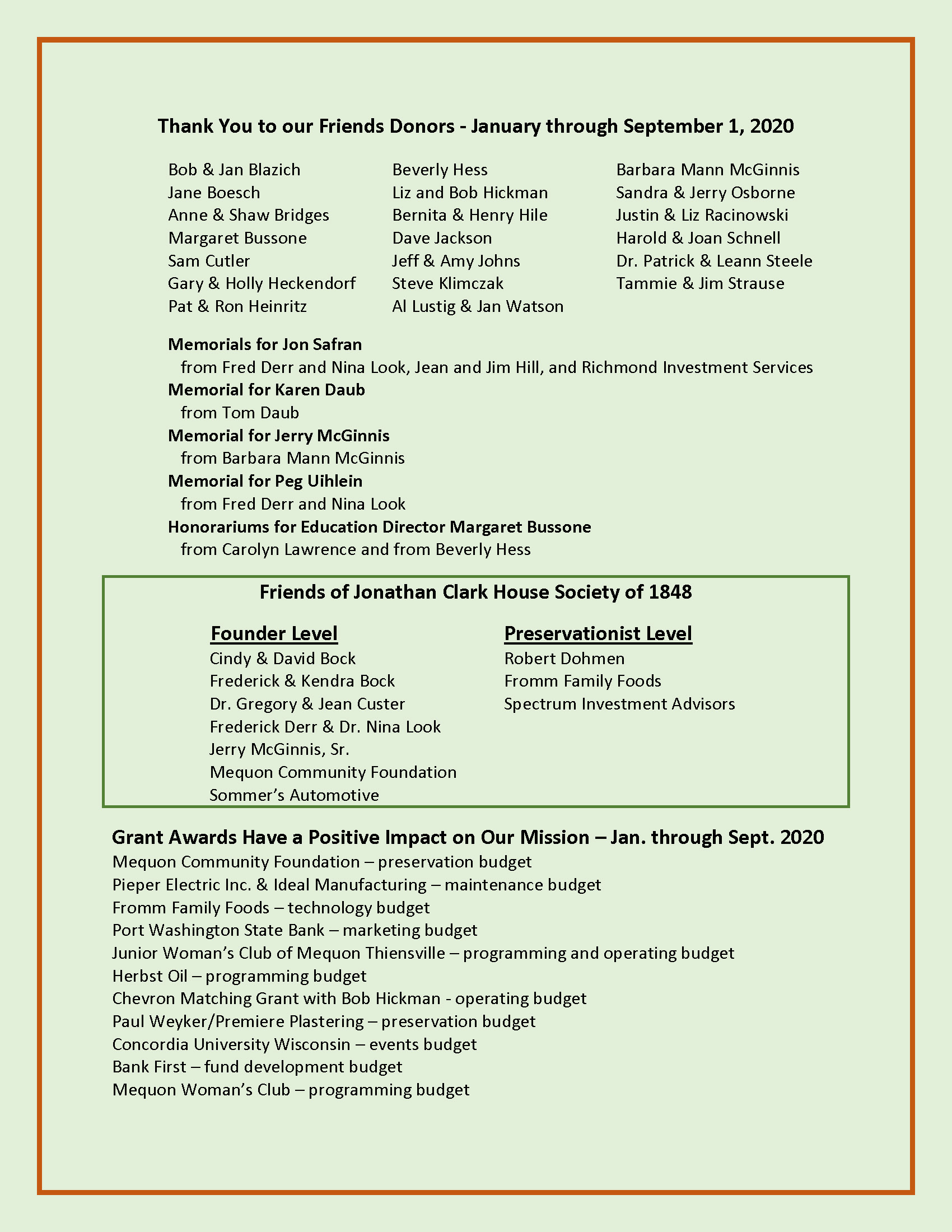 P. S. All the group and non-mask photos in the September newsletter were taken in pre-pandemic days. We’re looking forward to being able to offer in-person activities at the Jonathan Clark House as soon as it’s safe to do so. Until then, take care and be well.
