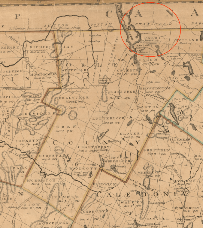 See the red circle at the top of the detail map? That is the Derby-Stanstead area that will be the focus of many of our upcoming posts and research. To the west of both towns is Lake Memphremagog, an important part of the essential water-transport route in this part of New England and Lower Canada. This detail map also shows all of Orleans county, Vermont (outlined in yellow), including the town of Derby. Midwestern map readers that expect to see rectilinear counties laid out on symmetrical north-south aligned grids will notice the asymmetrical alignment and shape of the Orleans county boundaries. This is typical of colonial-era surveying and land-division practices.