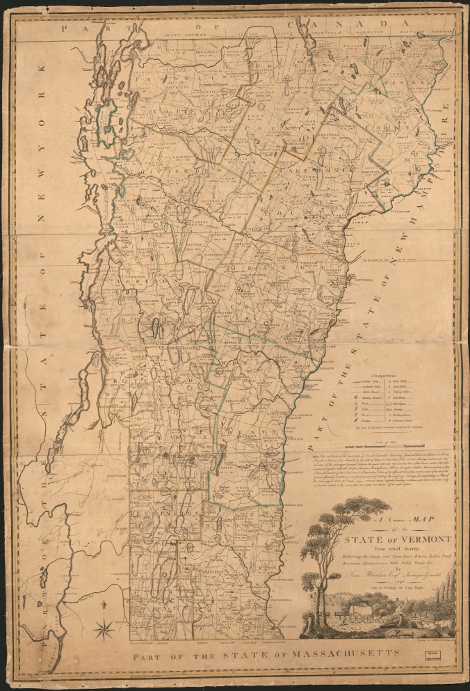 Whitelaw, James, and Amos Doolittle. A correct map of the state of Vermont: exhibiting the county and town lines, rivers, lakes, ponds, mountains, meetinghouses, mills, public roads &c. [New Haven, Conn.: Amos Doolittle, 1796] Map. https://www.loc.gov/item/2011589152/. Click to open larger image in new window.