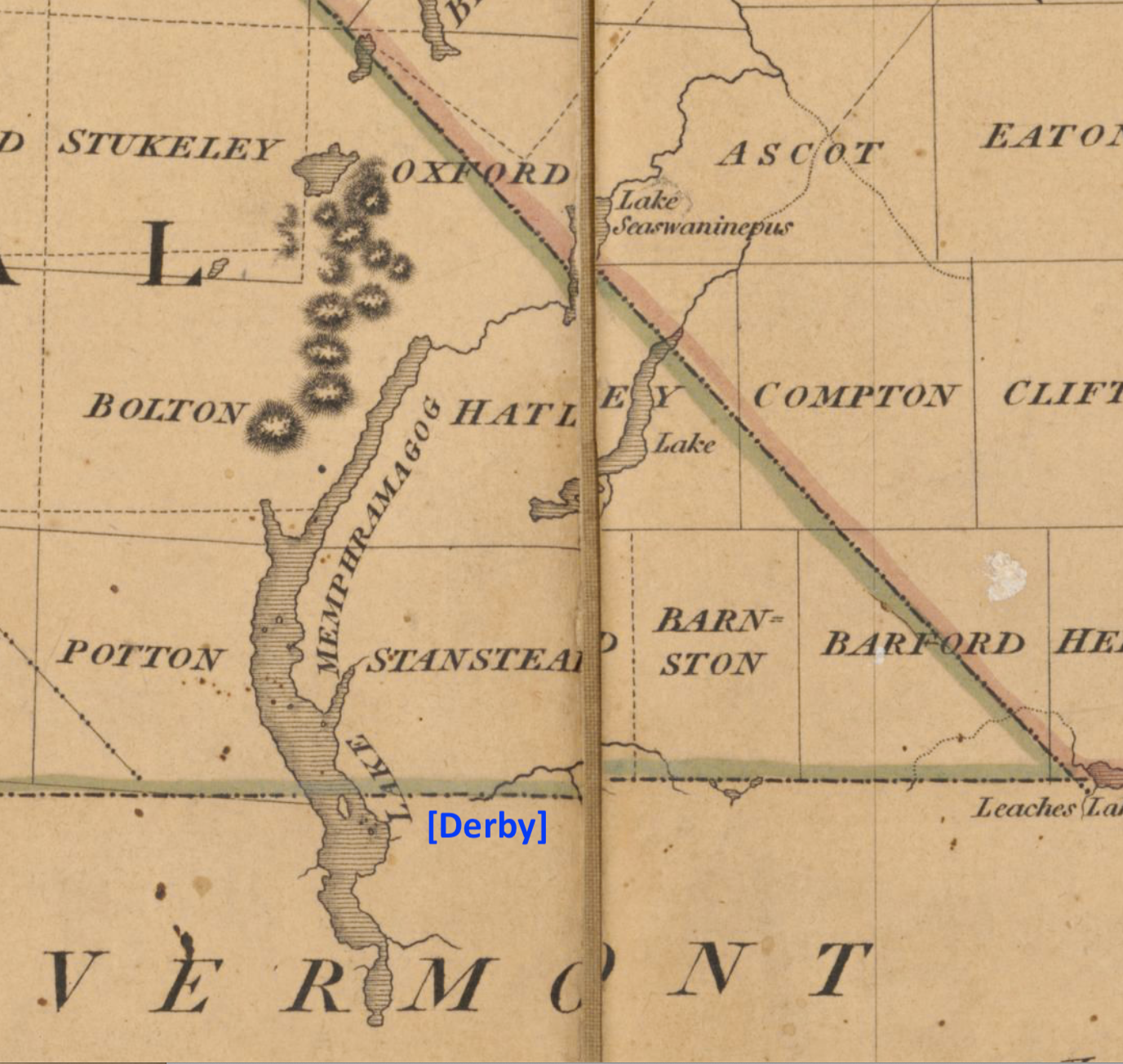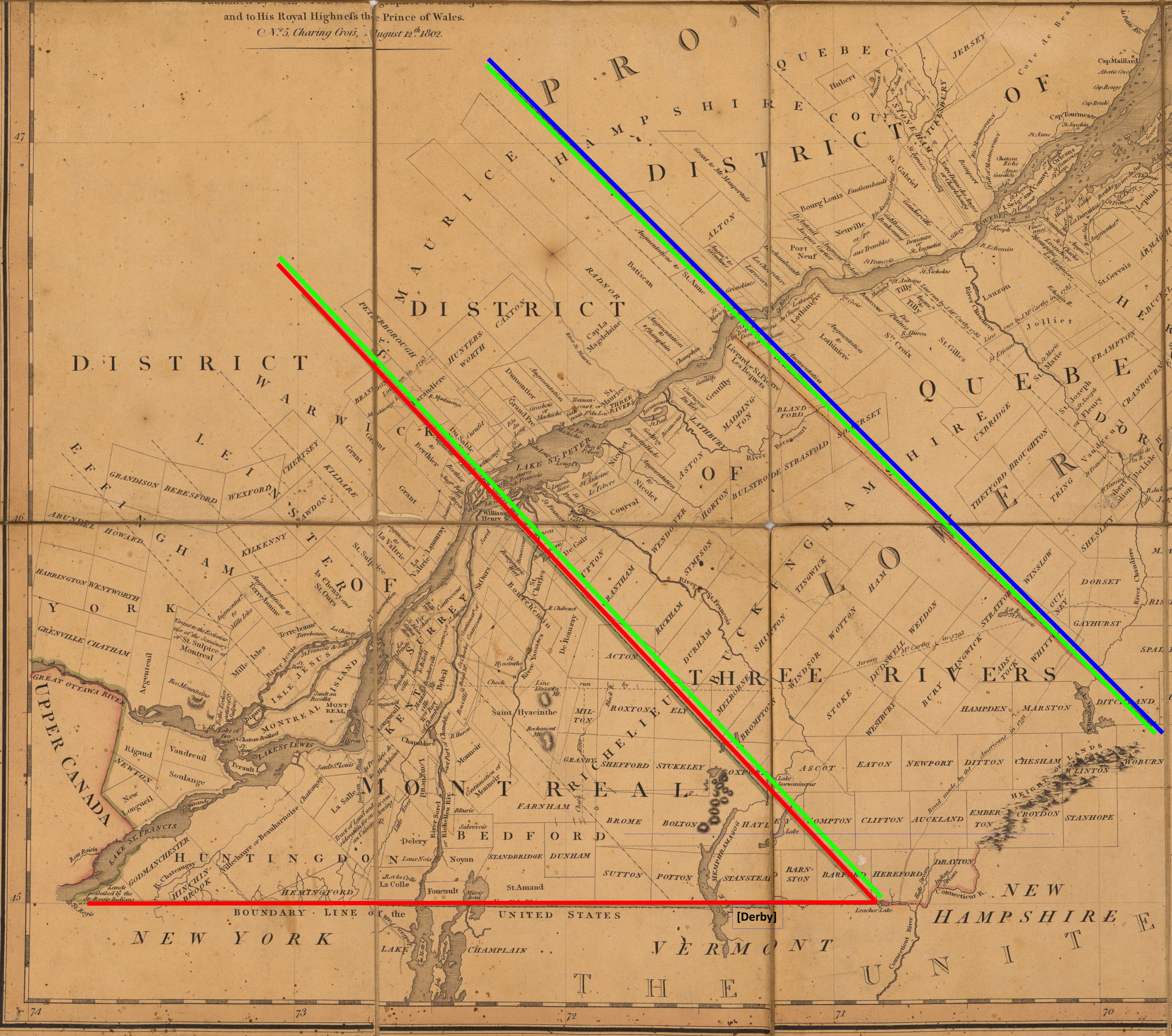Following the British victory in what we in the U.S. call the French and Indian War, and especially following the passage of the Constitutional Act 1791, the British government began to push for increased settlement in the inland areas of Lower Canada adjacent to the future U.S. states of Maine, New Hampshire, Vermont and New York. These new settlement areas were surveyed according to British North American practice, where the land is divided into squares or rectangles of various sizes, all of which are orientated along north-south and east-west lines. This detail from the map shows the area just north of Vermont and New Hampshire (I’ve added the future location of JMC’s other “official” birthplace, Derby, Vermont in blue):