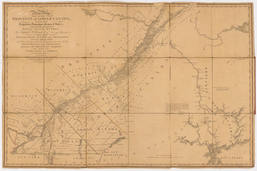 Holland, Samuel, A New map of the province of Lower Canada describing all the seigneuries, townships, grants of land, &c. compiled from plans deposited in the Patent Office Quebec by Samuel Holland, Esqr. Surveyor General, to which is added a plan of the rivers, Scoudiac and Magaguadavic, surveyed in 1796, 97, and 98 by order of the Commissioners, appointed to ascertain the true River St. Croix intented by the Treaty of Peace, between his Britannic Majesty, and the United States of America, London, 1802.
