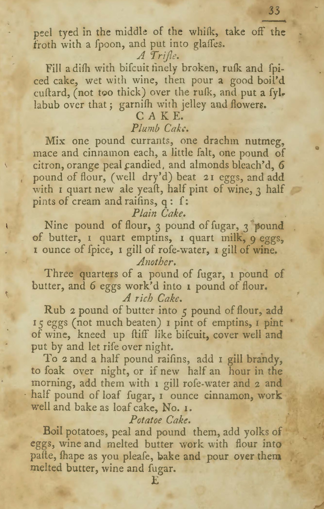 It’s possible that Jonathan’s and Mary’s mothers knew this book, or similar collections of recipes inspired by it that appeared in the decades following its publication. And if they wanted to celebrate an event with a nice baked treat, the book has several pages of recipes for sweet and savory cakes. Here’s page 33, the first page of cake recipes, featuring five kinds of cakes: