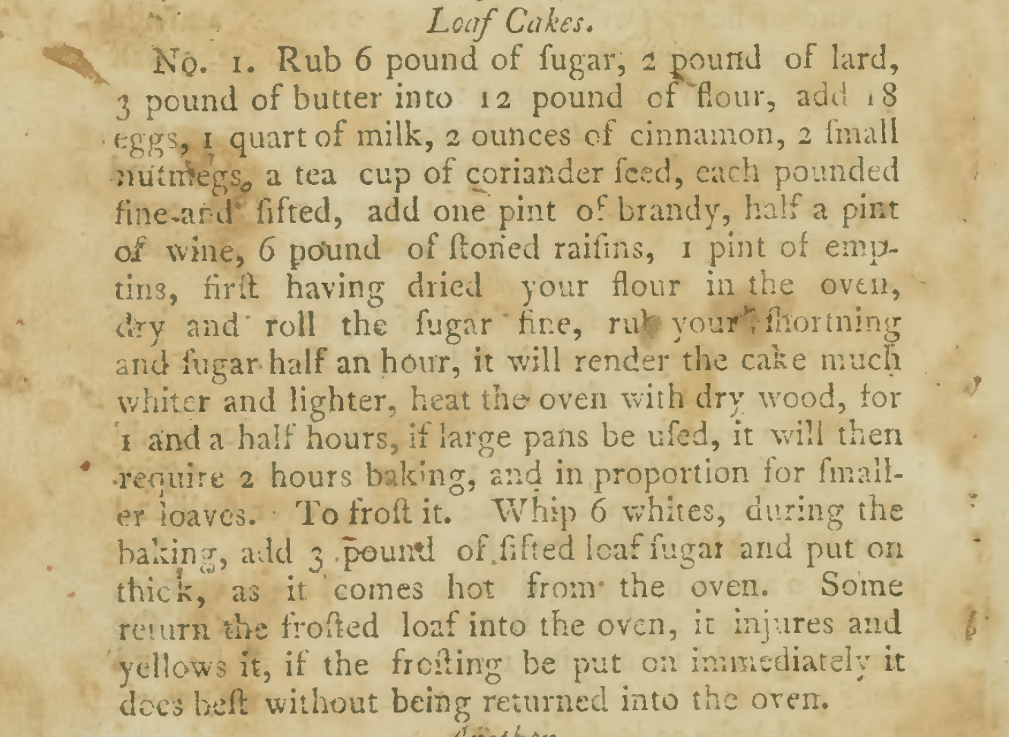 Oh ho! Are these Loaf Cakes the ancestor to the modern American birthday cake? It has emptins to leaven the cake, and egg whites for cohesion (and fluffiness?). And lots of time spent rubbing (i.e., whipping? or stirring?) the ingredients. But we also have large amounts of lard, along with a pint of brandy and a half-pint of wine. Whew. Readers, what sort of cake is this? (It’s not lite, to say the least!)