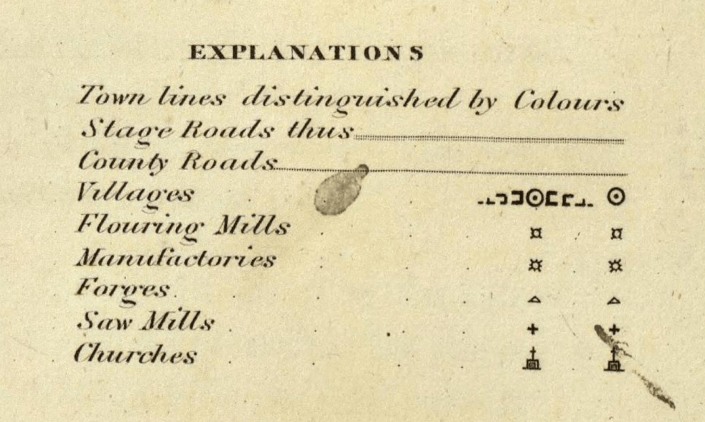 According to the map, the town of Athens was mostly rural and, presumably, agricultural. But there were flouring mills and manufactories in the town of Catskill, and at least six sawmills in the town of Coxsackie. And while the key lists a symbol for churches, it looks like the mapmakers did not note them on this map. (We know from other sources that there were churches in these towns in the early 1800s.)