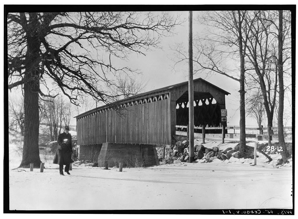 Cedarburg Covered Bridge, Ozaukee County, Wisconsin, photo c. 1934, public domain, from the Historic American Buildings Survey (HABS) via the Library of Congress. Click to open larger image in new window.