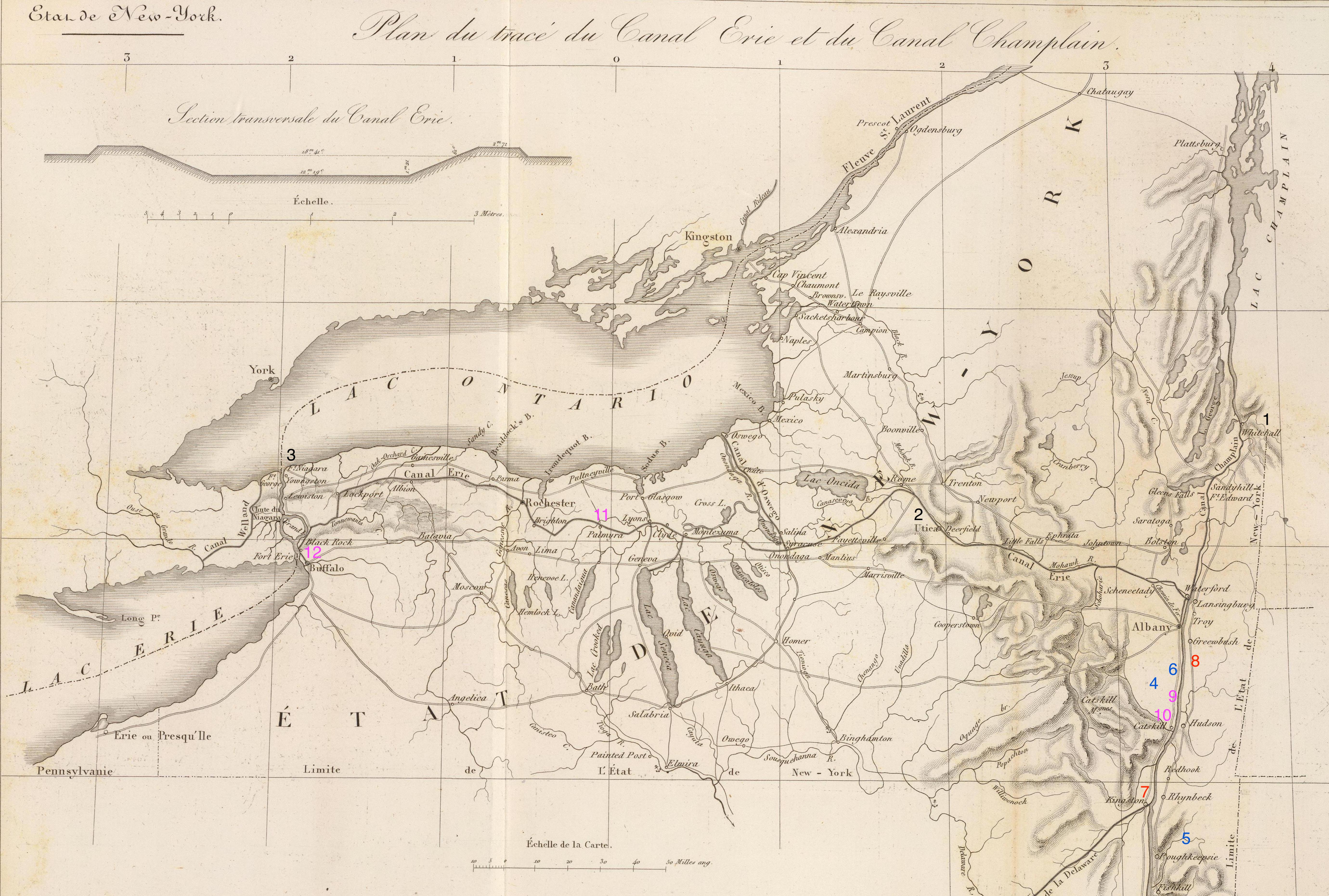 This elegant map is from an atlas of maps describing United States public works construction projects—or “improvements”—projected or completed during the years 1824-1831, published in Paris in 1834. The main part of the map shows the course of both canals: the Champlain Canal as it connects southern Canada and western New England to the Hudson River at Albany, and the Erie Canal as it progresses from Albany to Buffalo and Lake Erie, along with the geography and populated places of upstate New York. Below this is a profile map showing the elevations of the various parts of both canals and their locks.