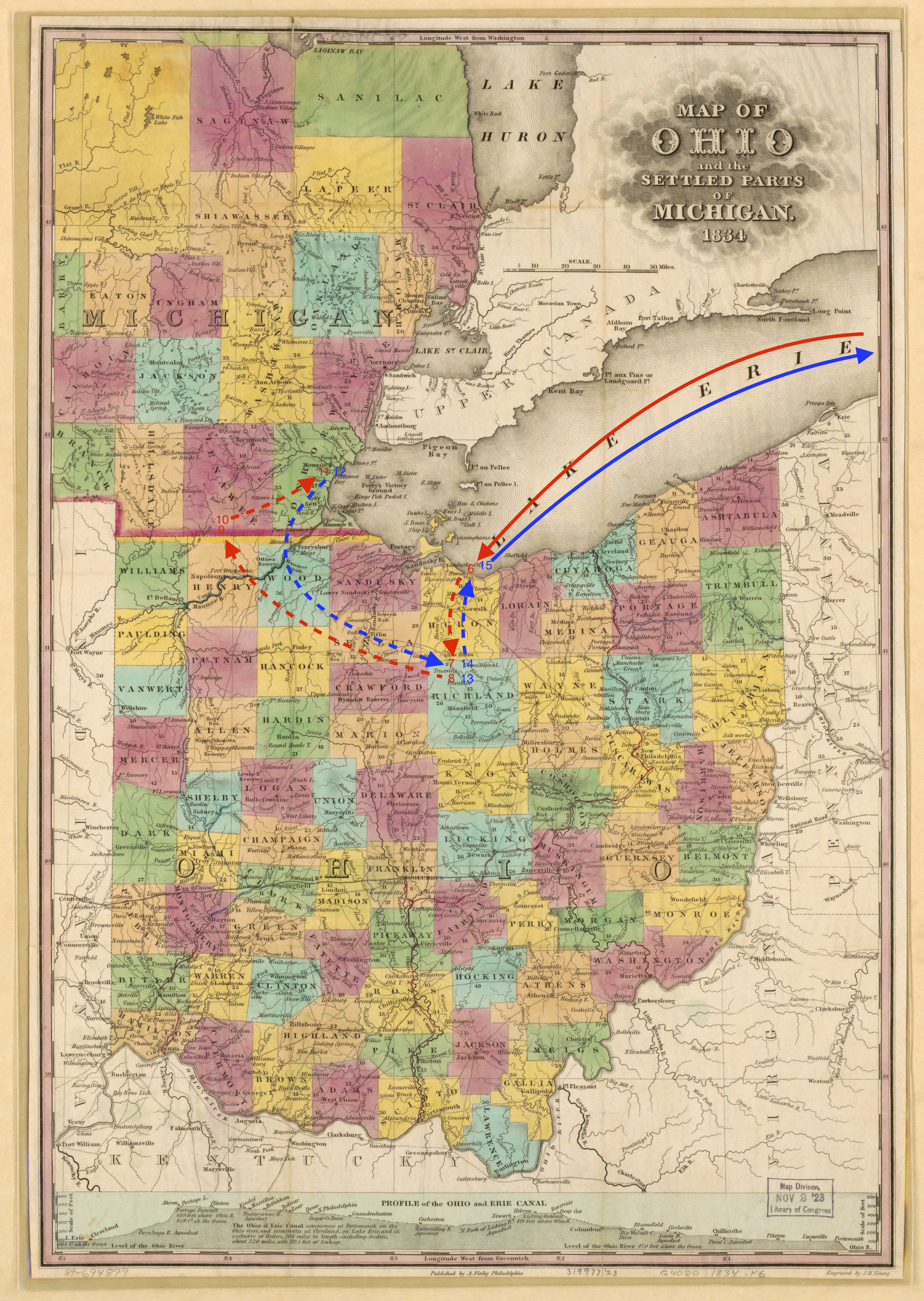 Young, J. H, and A Finley. Map of Ohio and the settled parts of Michigan. [Philadelphia: A. Finley, 1834]. Library of Congress. Click here to open a copy of the original map without annotations. Click the map to open a larger image in a new window.