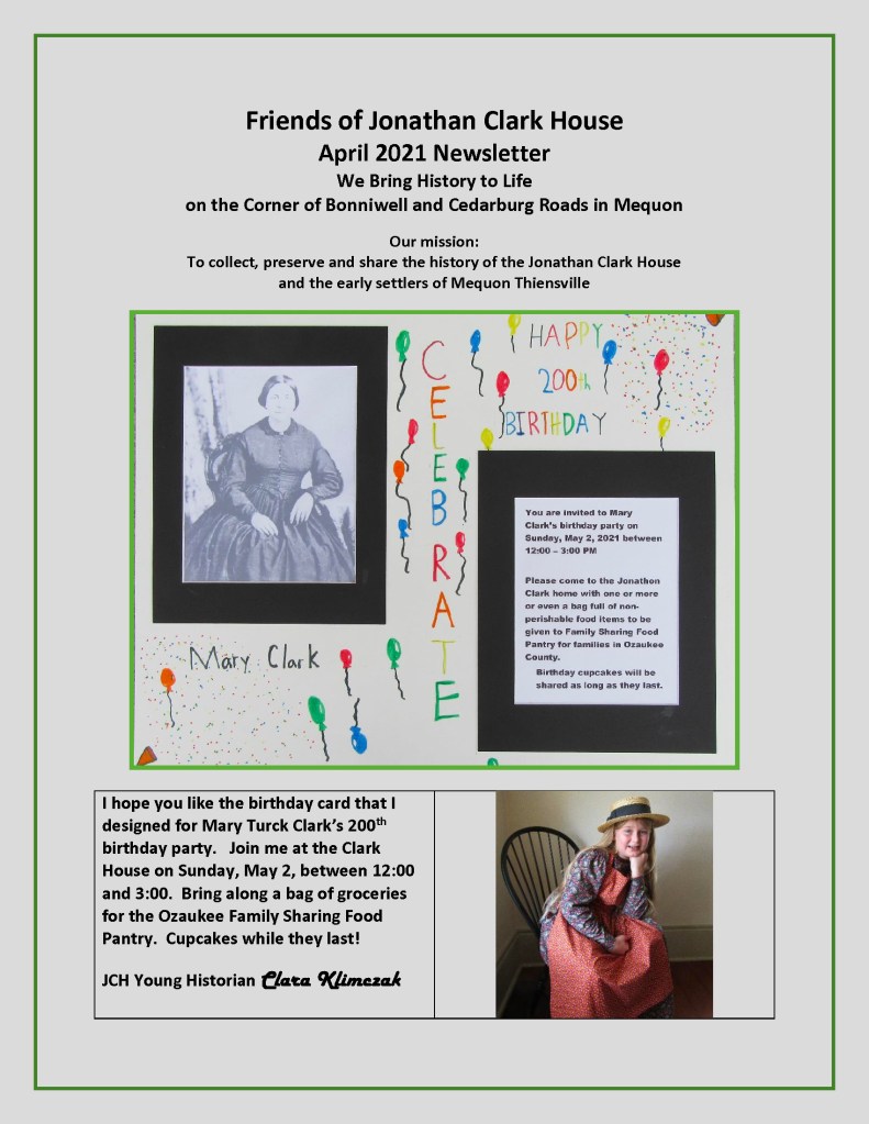 As you’ll see, our Young Historians have been busy. Take note of Clara Klimczak’s festive card announcing Mary Turck Clark’s upcoming 200th birthday party at the Clark House, Sunday, May 2, 2021, between 12:00 and 3:00 p.m. Please join us and bring some non-perishable groceries for the Ozaukee Family Sharing Food Pantry.