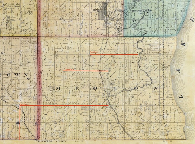 I think Reuben Wells’s April 5, 1841 proposal was built, but not quite as originally planned. I think—and I’d love to hear from anyone that knows more about this—that road No. 4 was the first segment of the current Cedarburg Road. In 1841 it would have been the first connection between the most-populated district in the area, the Bonniwell District, and the growing hamlets of Hamilton, Cedarburg, and Grafton, and with the existing Green Bay road to the northeast.