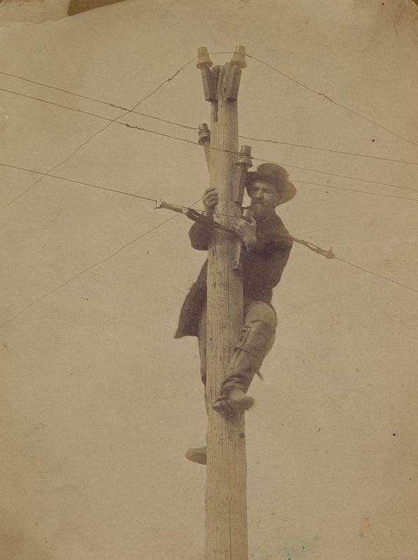 United States Army. Military Railway Service, Russell, Andrew J, photographer. [Worker Repairing Telegraph Line?]. United States, ca. 1862. [or 1863] Photograph. Library of Congress.