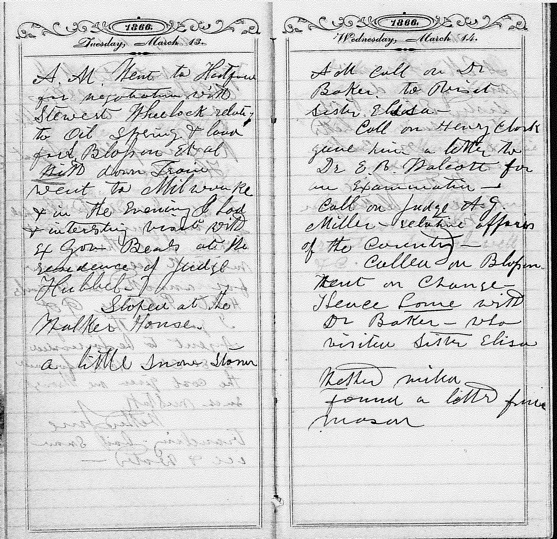 The “Dr. E. B. Wolcott” mentioned in Maxon’s March 14 diary entry is probably Dr. Erastus B. Wolcott. Page 254 of the 1866 Milwaukee City Directory lists Erastus B. Wolcott, physician, residence at 515 Milwaukee [street]. The same page shows that he practiced as half of “Wolcott & Marks,” with physician Solon Marks, at 136 Wisconsin [street].