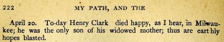 April 20. To-day Henry Clark died happy, as I hear, in Milwaukee; he was the only son of his widowed mother; thus are earthly hopes blasted.