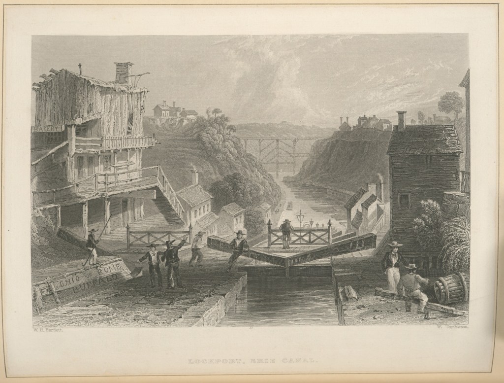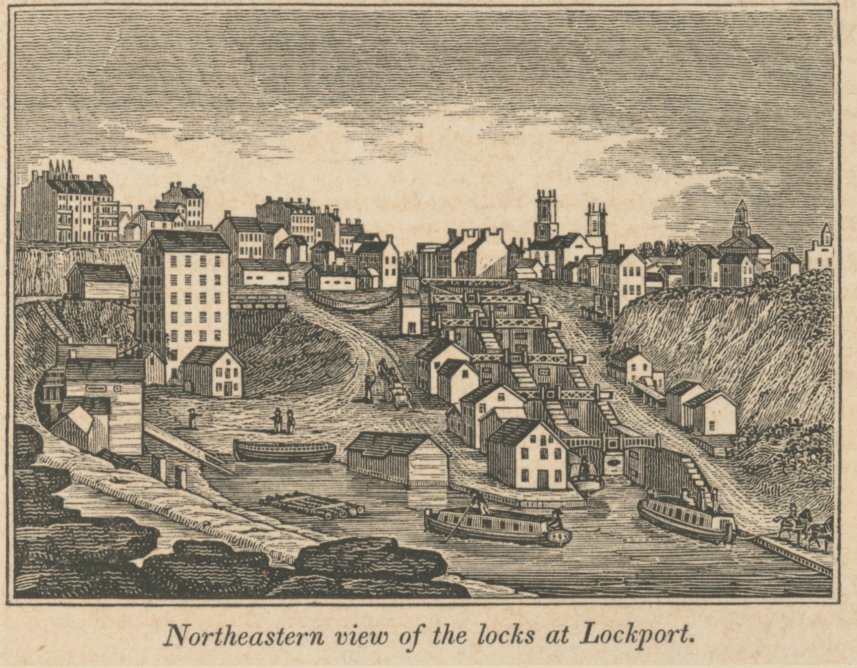 Deep Cutting, Lockport, in Cadwallader Colden, et. al., Memoir…at the Completion of the New York Canals, New York, 1825. Image from “extra-illustrated” edition in New York Public Library Digital Collections, scanned copy of standard edition of book via GoogleBooks. Click to open larger image in new window.
