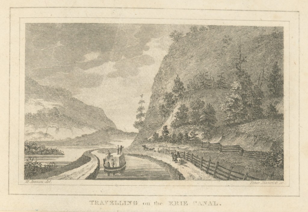 Traveling on the Erie Canal, in Cadwallader Colden, et. al., Memoir…at the Completion of the New York Canals, New York, 1825. Image from “extra-illustrated” edition in New York Public Library Digital Collections, scanned copy of standard edition of book via GoogleBooks. Click to open larger image in new window.