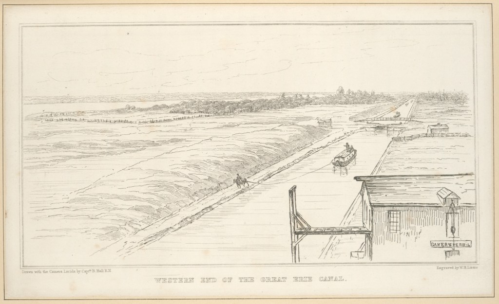 It’s not clear exactly where this view of the “western end of the Erie Canal” is located. Is it supposed to be between the top of the Lockport Locks and Buffalo? The terrain is open and flat, so this could be the final stretch of the canal before it meets Tonawanda Creek and flows into Lake Erie. But that part of the canal did not, I believe, have any locks.