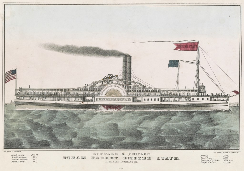 N. Currier. Buffalo & Chicago steam packet Empire State: M. Hazard, Commander. New York, circa 1835-1856 (probably 1848 or later, see below). Photograph of hand-colored lithograph. Library of Congress. Click to open larger image in a new window.