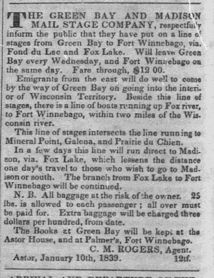 - Line of Stages from Green Bay (on Military Road?) Wisconsin Enquirer, April 27, 1839, p. 4