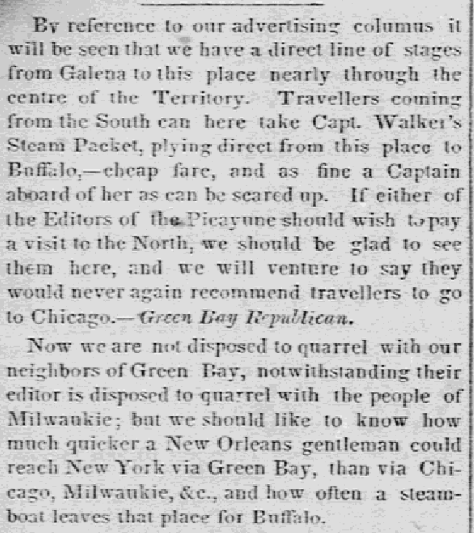 - Line of Stages & steamboat to Green Bay, etc, Green Bay Republican, reprinted with commentary in Milwaukee Weekly Sentinel, August, 3, 1842, p.2