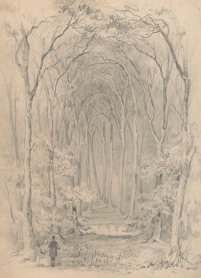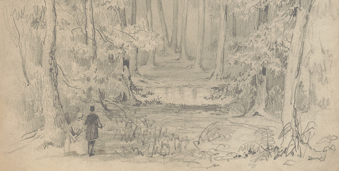 Queen, James Fuller, [A Man and a Woman Standing at the Entrance to a Trail Through a Forest] (detail), graphite drawing on cream paper, circa 1850-1870. Library of Congress