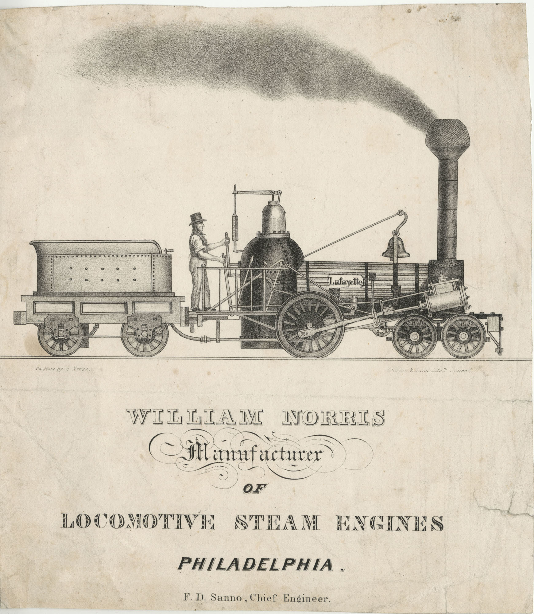 - William Norris manufacturer of locomotive steam engines Philadelphia: F.D. Sanno, chief engineer. / On stone by A. Newsam, Philadelphia: Lehman & Duval, lithrs., circa 1837. Credit: Library Company of Philadelphia.3
