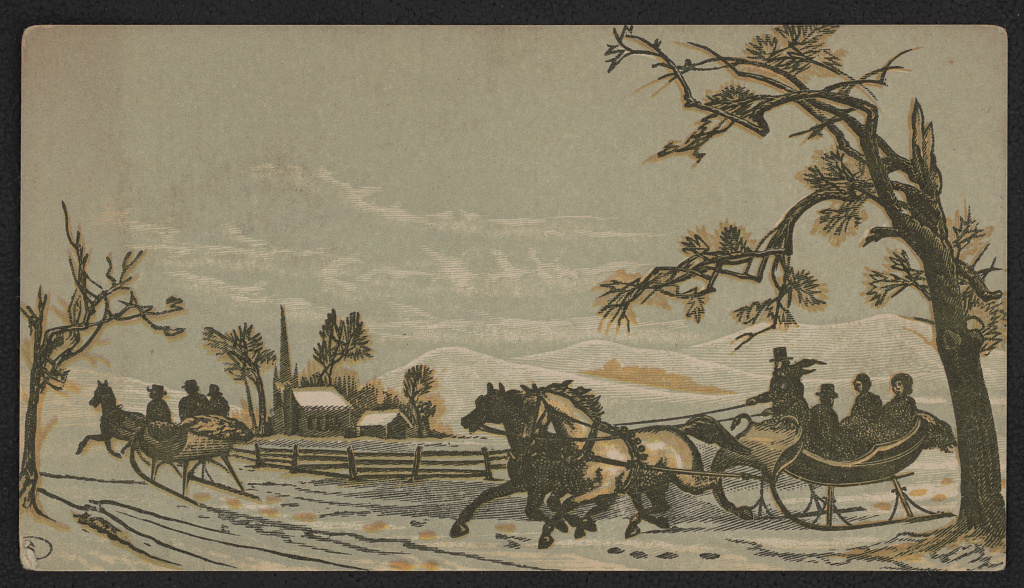 - Winter Outing With People Riding in Horse-Drawn Sleighs Across a Snow Covered Landscape Toward a Church in the Distance, [Place not identified: publisher not identified, between 1880 and 1890], Print, color wood engraving. Library of Congress.