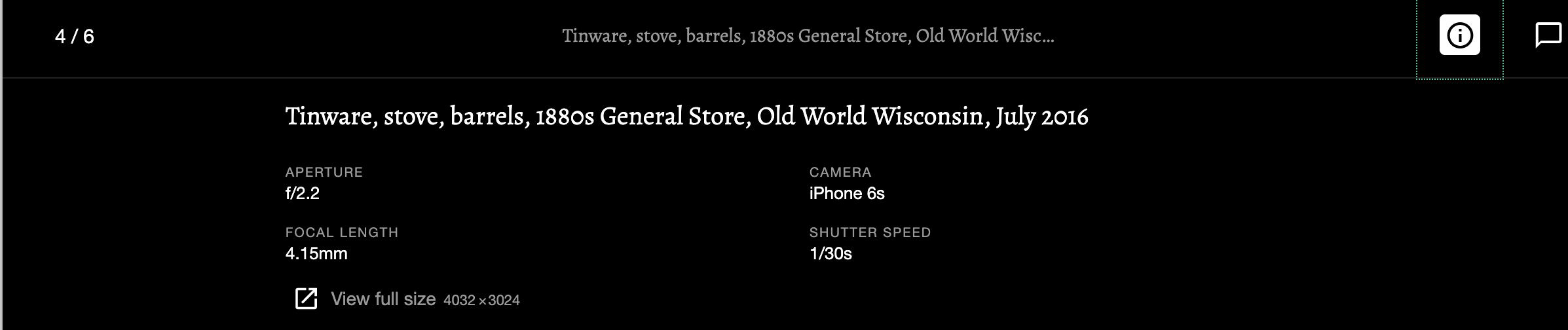 If you find an image that you’d like to see in detail, click on the info symbol (ℹ︎) in the lower-right corner. That expands the caption area to something like this: