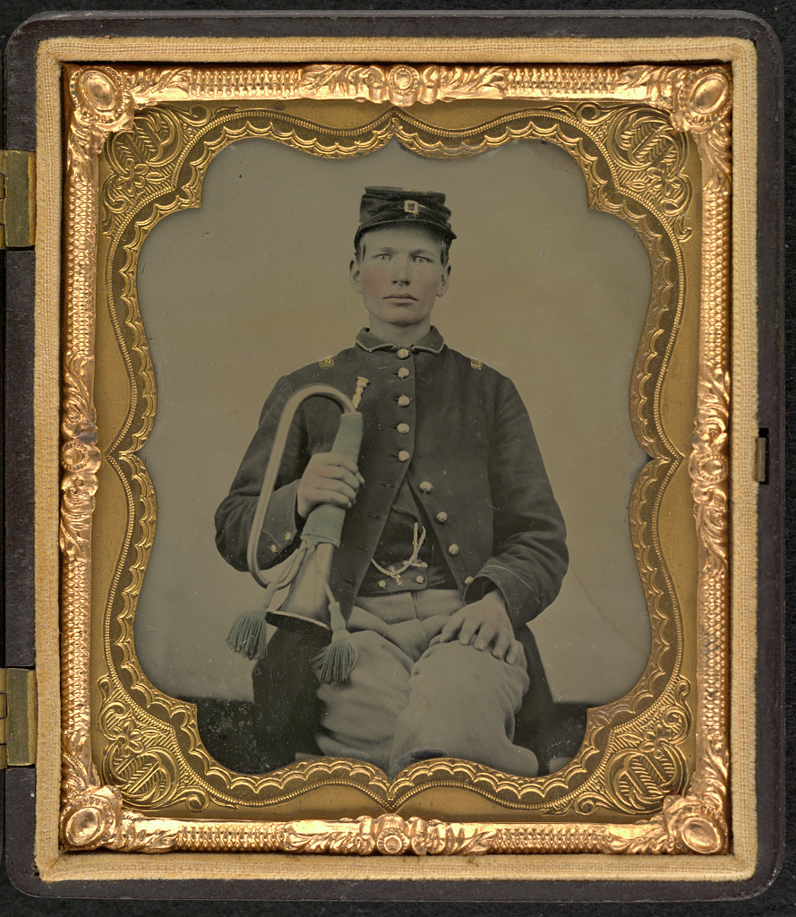 [Unidentified soldier in Union uniform with bugle], photographer unknown, United States, c. 1861-1865, Library of Congress. Note: this is not a photograph of Evander B. Bonniwell, but of another young, unknown, Union Army bugler from Evander Bonniwell’s era.