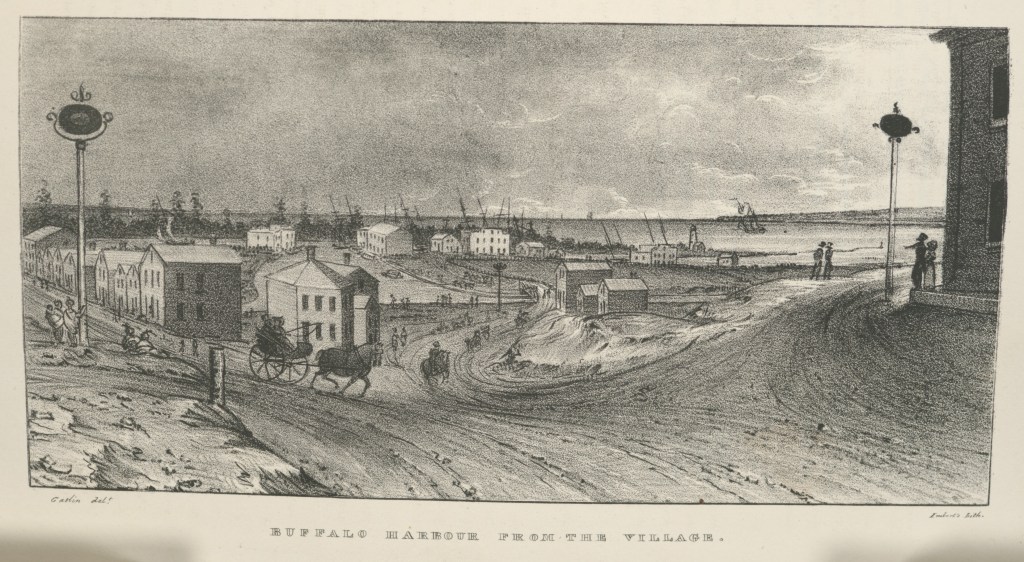 Buffalo Harbour from the Village, in Cadwallader Colden, et. al., Memoir…at the Completion of the New York Canals, New York, 1825. Image from “extra-illustrated” edition in New York Public Library Digital Collections, scanned copy of standard edition of book via GoogleBooks. Public domain. Click to open larger image in new window.