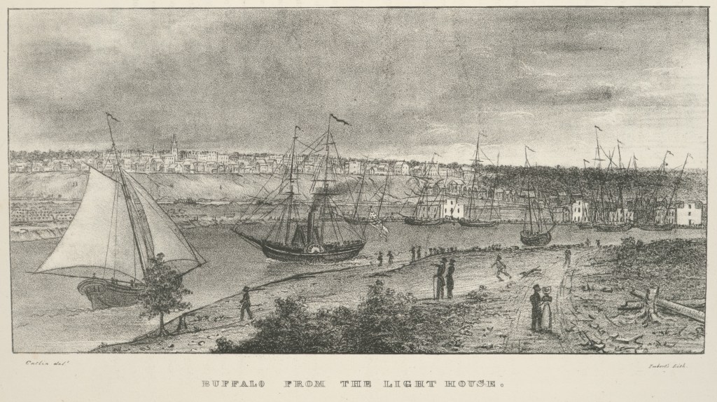 If you only have time to read one of these, I recommend reading Monday: Map Day! – The Erie Canal, from February 15, 2021. That post is focused on how Jonathan M. Clark, Mary (Turck) Clark, and the Turck and Gay families migrated in stages from their homes in the northeast to their new homes in upstate New York and then on to Wisconsin in the 1820s and ’30s. This February post also includes a really informative, downloadable, high-resolution map of New York state and the canal system, circa 1834 (2 versions: original and with my annotations), plus the dates of quite a few family birthdays and links to many other relevant Clark House Historian posts. - To be fair, the Erie Canal did not officially open until October 26, 1825. If these first two images of Buffaloo were made as part of the official opening journey and celebration (and I believe they were), then it’s likely that Great Lakes shipping, modest as it was in pre-canal days, was wrapping for the year and preparing for the close of shipping until next spring. So these two pictures may not be completely representative of Buffalo harbor traffic circa 1825 and earlier.