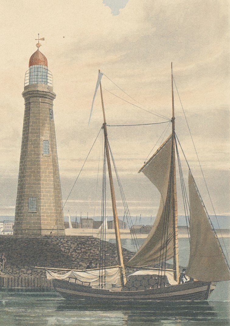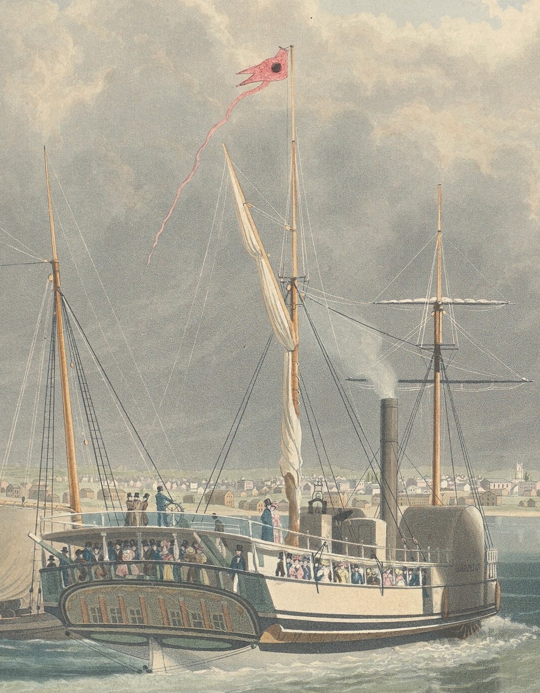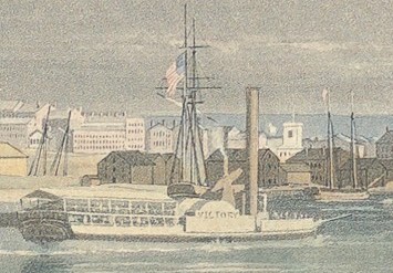 Across the water to the right, in front of what look like several large warehouses, six large, double-masted schooners lie at anchor with sails furled. Just left of center is a two-masted, side paddlewheel steamer, the Superior. Sailing along the the left side of the print is a single-masted gaff-rigged sloop with its mainsail and foresail raised.3 The shoreline in the foreground, bare and undeveloped, provides a place for local folk to stroll and watch the ships.