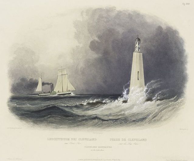 Bodmer, Karl. “Leuchtthurm bei Cleveland am Erie See. Phare de Clevelandsur le Lac Erie. Cleveland Lighthouse on the Lake Erie.” The New York Public Library Digital Collections. Published 1840 – 1843, original drawing c. 1834. Click to open larger image in new window.