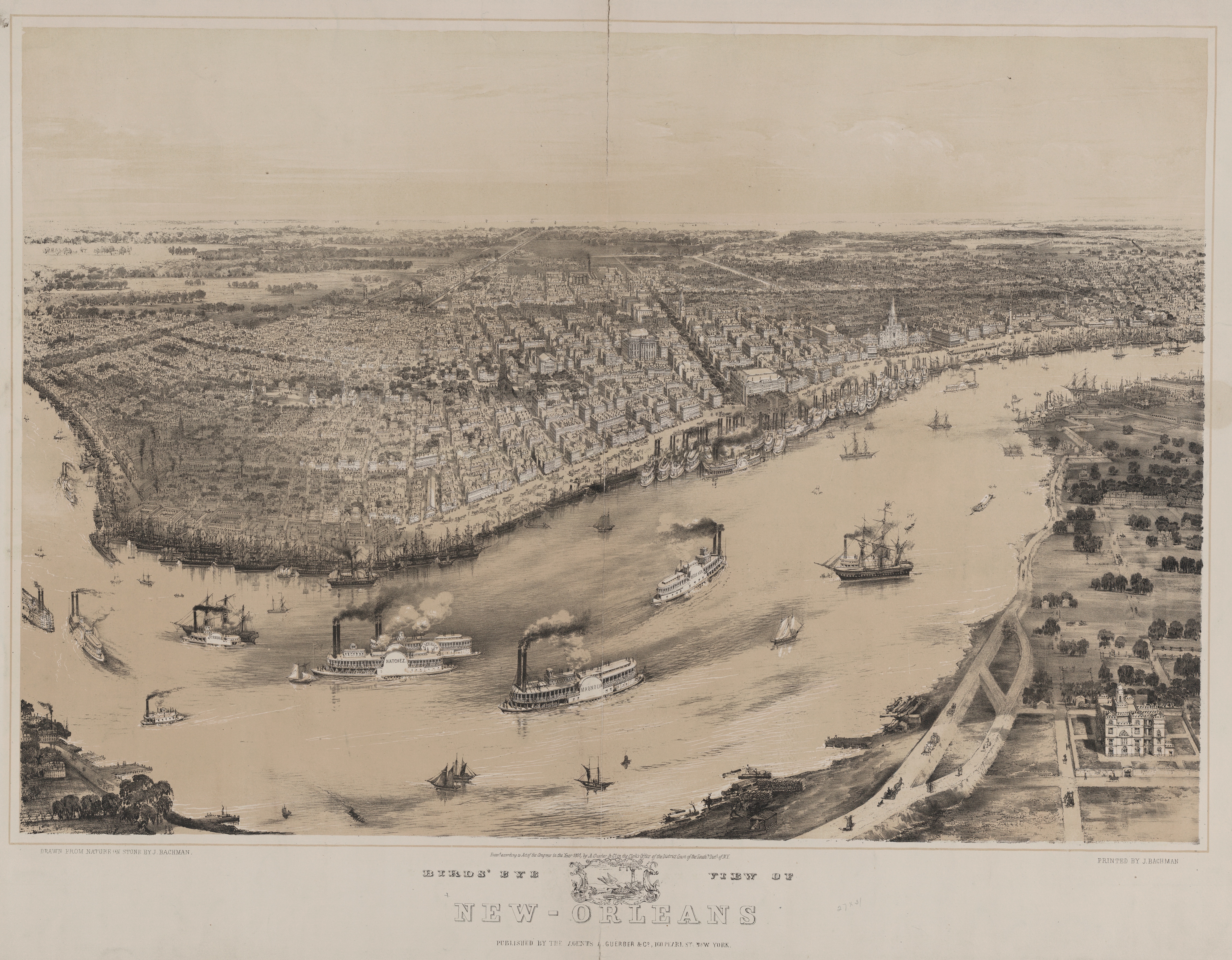 Bachmann, John, Birds’ eye view of New-Orleans / drawn from nature on stone by J. Bachman, [i.e., Bachmann], ca. 1851. New York: Published by the agents A. Guerber & Co., Printed by J. Bachman. Library of Congress. Click to open larger image in new window.