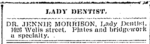 “Lady Dentist. Dr. Jennie Morrison,” advertisement, Milwaukee Journal Sentinel, July 26, 1897, page 7. Via genealogybank.com