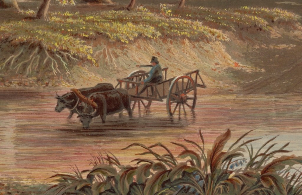 Bennett, W. J. , Engraver, and George Harvey. Autumn. No. 4. Gigantic sycamores. An ox team crossing the ford. Owl Creek, Ohio / engraved from the original painting by G. Harvey A.N.A., New York, 1841. Color aquatint and letterpress text (original and detail). Library of Congress. Click to open larger image in new window.